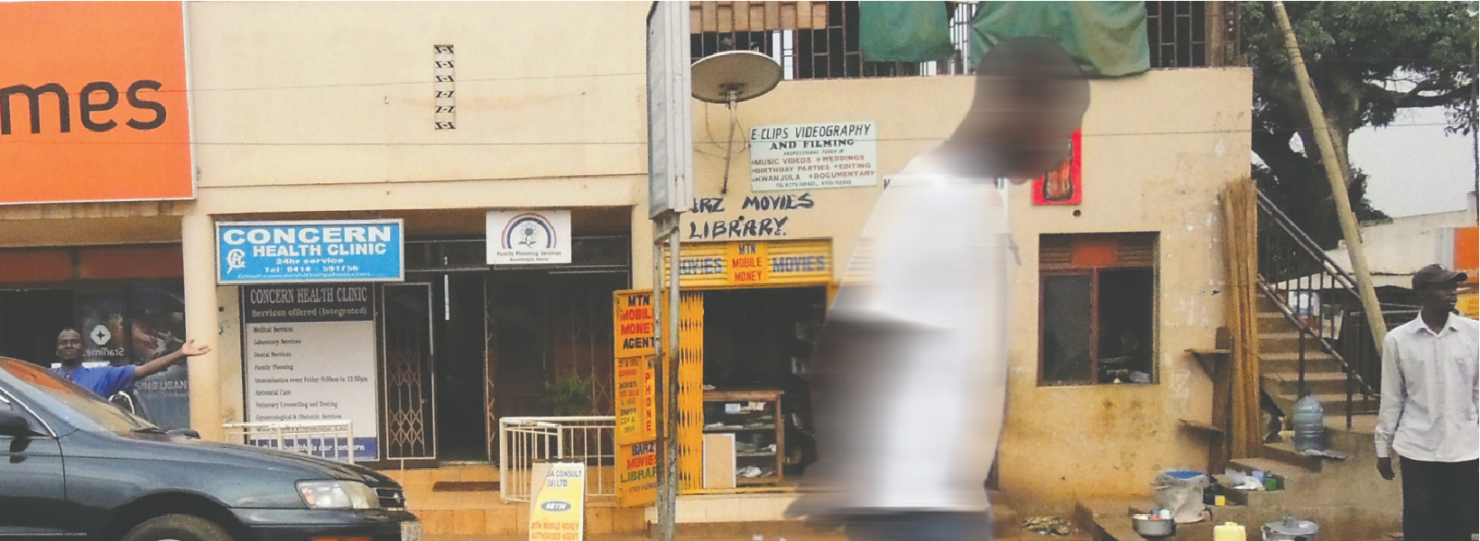 The image shows a blurry person walking in front of a city scene, seemingly in Ghana.